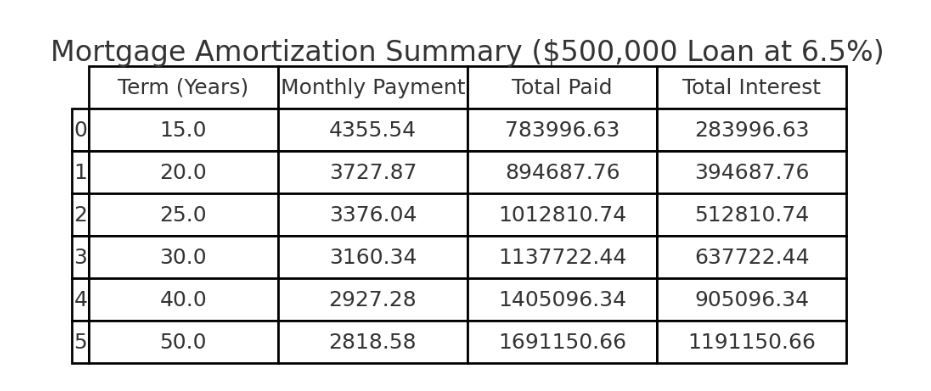 Comparing 15, 20, 25, 30, 40, and 50-year mortgage terms for a $500,000 loan at 6.5% interest.––